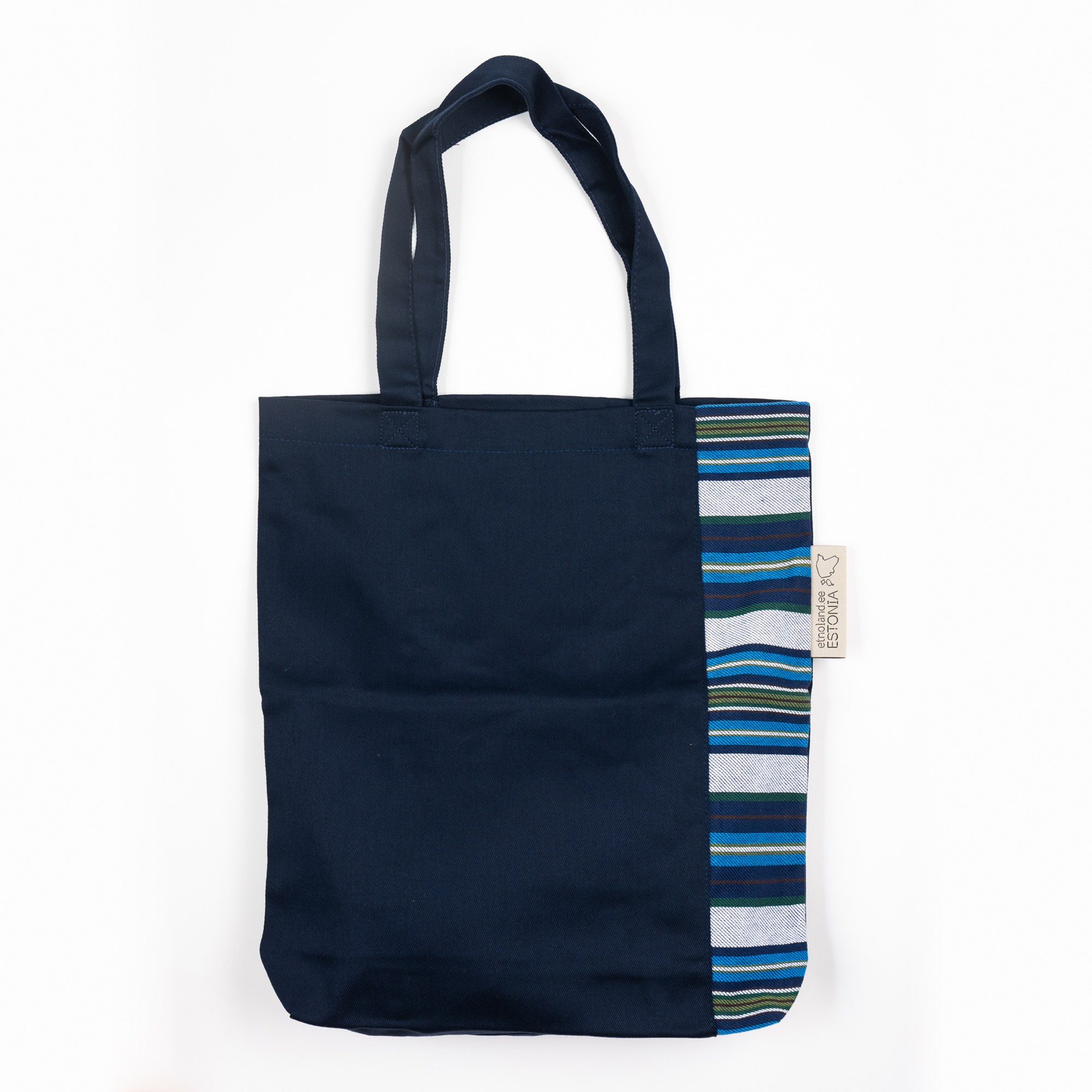 Jõelähtme mustriga väike tumesinine ostukott.